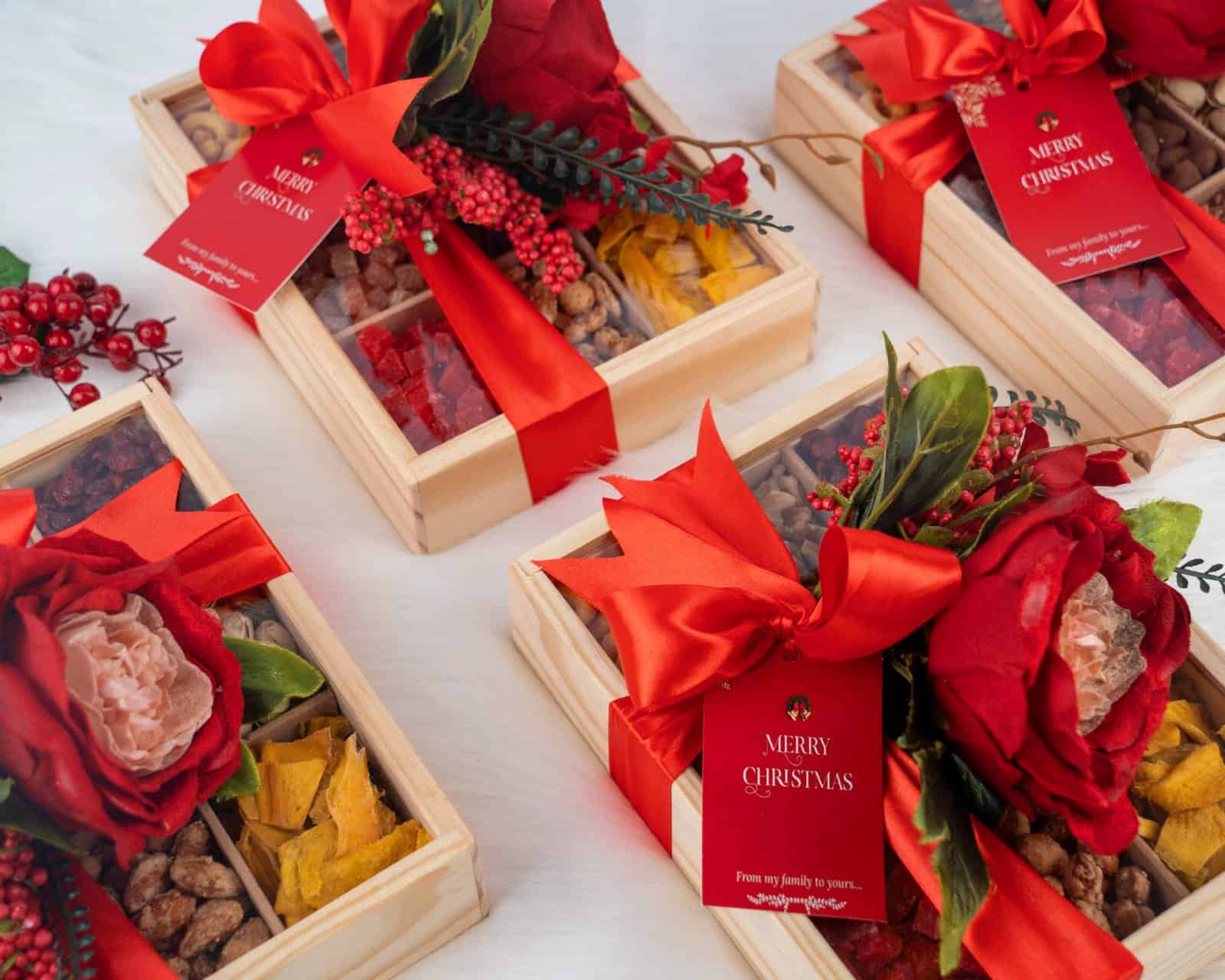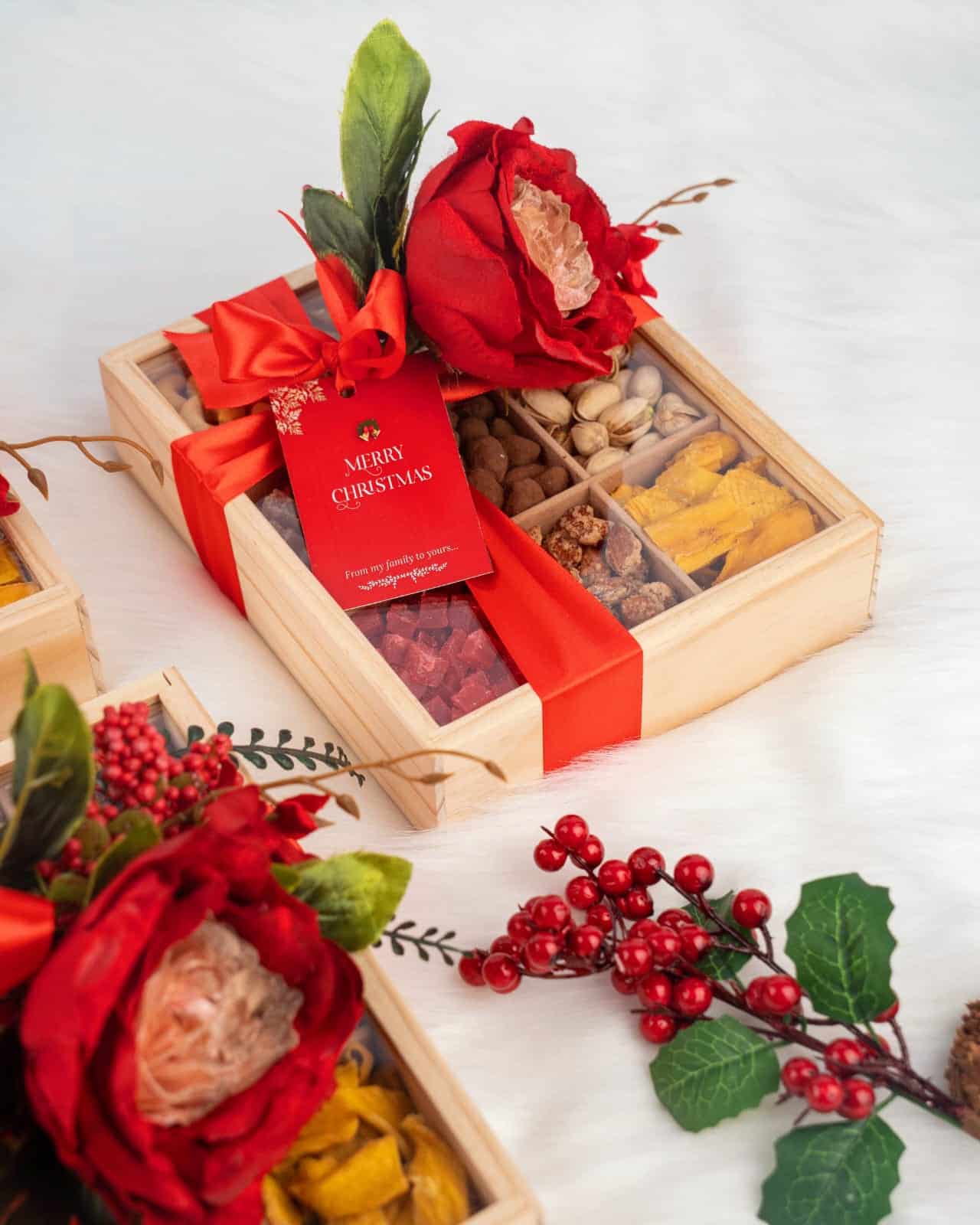 Share the joy this season with our Luxury Wooden Christmas Snack Box โ a curated selection of gourmet nuts, premium dried fruits, ย arranged in a pine wooden box and finished with festive red satin ribbon and floral dรฉcor.